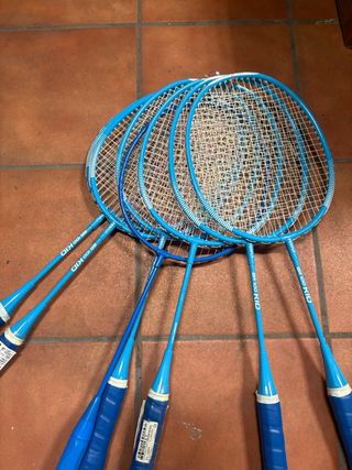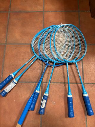 Conjunto de cinco raquetas de bádminton de color azul, diseñadas para niños. - Marco y eje de color azul. - Empuñadura azul con cinta blanca. - Cuerdas blancas y rojas.