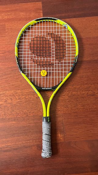 Raqueta de tenis Artengo con marco amarillo y negro. - Cuerdas negras. - Empuñadura con cinta blanca y negra.