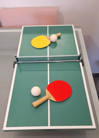 Mesa de ping pong en perfecto estado. Incluye dos palas y una red. - Medidas: 61cm x 31cm - Ideal para jugar en casa - Incluye dos raquetas y red.