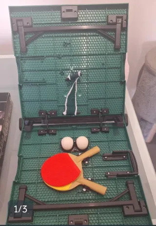 Juego de ping pong de mesa en tamaño pequeño para casa y para llevar, ideal para jugar en cualquier lugar. Incluye dos raquetas, una roja y otra azul, con sus respectivos mangos de madera, y una pelota blanca, también la red con sus postes y ventosas para mantenerse en pié. Todo está nuevo y en perfecto estado (sin mas uso que el de abrirlo y probarlo). - 2 raquetas de ping pong de tamaño pequeño. - 1 pelota de ping pong blanca. - 1 red con postes y ventosas. - Ideal para jugar en casa o llevarlo contigo. Incluyo otra pelota de ping pong.