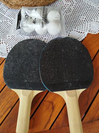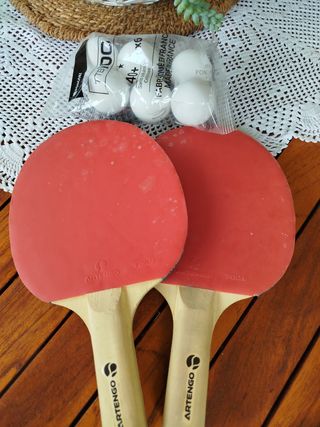 Juego de dos raquetas de ping pong y seis pelotas nuevas. Las raquetas se ven en buen estado, listas para usar. - Incluye 2 raquetas de ping pong ARTENGO. - 6 pelotas de ping pong incluidas.