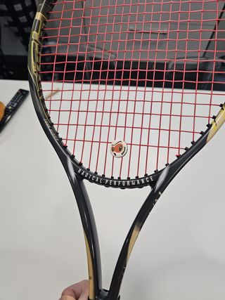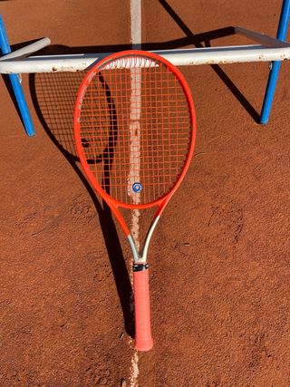 Raqueta profesional de un exjugador del Top 100 del ATP. Unico Raqueta de tenis de la marca Head con cordaje profesional - Marco de color naranja y azul. - Cuerdas de color verde brillante. - Empuñadura de cuero.