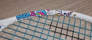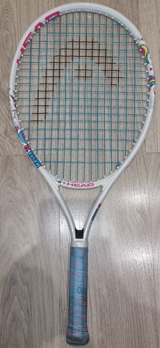 Raqueta de tenis para niñ@s, en buen estado. Ideal para principiantes. - Diseño colorido en tonos rosas y azules. - Mango en buen estado.