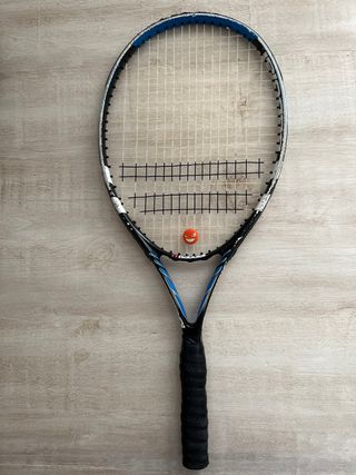 Raqueta Babolat Pure Drive de 255gr (27’’ peso ultralite), puño tamaño 0. Las compramos en Agosto, tienen medio año, porque le han hecho coger más peso (son de una niña de 11 años). Están encordadas con RPM Blast a 20/20, reciente. Una de las dos tiene 4/5 golpes enanos (ver foto), la otra un pequeño golpe en el cuello. Cuesta nueva 135€ sin encordar. Solo me queda una, 95€.