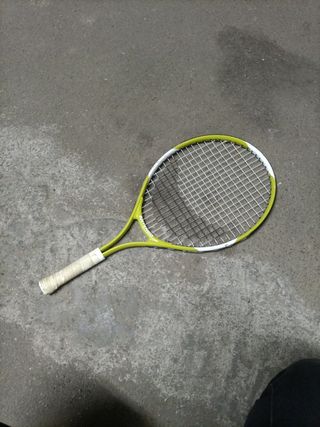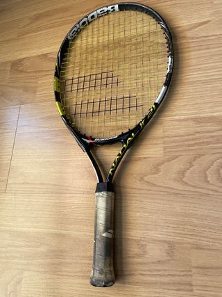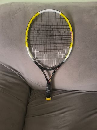 Raqueta de tenis Babolat para niños. - Diseño en color amarillo y negro. - Funda protectora incluida. - Tiene bastante uso pero es funcional. Pesa muy poco y estaría bien para niños que estan aprendiendo a jugar. -Habria que cambiar el grip del mango.