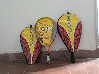 Lote de 2 raquetas de tenis Dunlop modelo Slam 21, perfectas para niños entre 4 y 6 años (longitud 21 pulgadas). Son muy ligeras y manejables, ideales para iniciarse en el tenis o las primeras clases en club. Incluyen funda original Dunlop para cada raqueta y están en buen estado general, con grip original y cuerdas tensas.