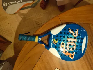 Raqueta de pádel Artengo para niños, modelo 28. - Color azul con detalles blancos y naranjas. - Diseño con agujeros en la cara. - Empuñadura azul. Si se quiere tiene funda por 8€