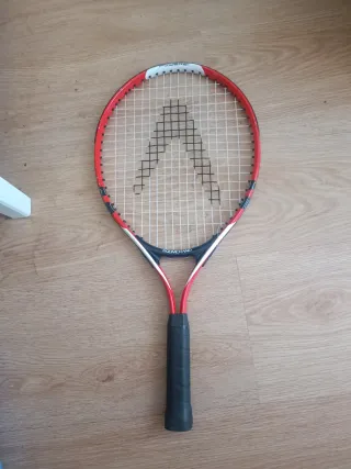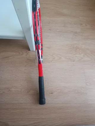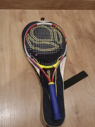 Raqueta de tenis de color rojo, blanco y amarillo, con empuñadura azul. - Diseño llamativo. - Ideal para jugadores jóvenes. Se entrega con funda y con otra raqueta más usada, de igual modelo y otro color