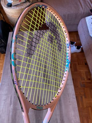Raqueta de tenis Head Coco 23, ideal para jóvenes tenistas. - Color rosa pastel con detalles coloridos. - Diseño ligero y manejable. - Para niñas de 6 a 8 años. - Viene con funda