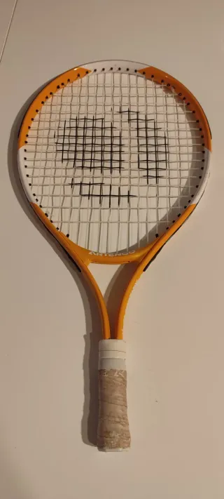 Raqueta de tenis para niños con un diseño llamativo en color naranja y blanco. Ideal para iniciarse en el deporte. - Marco de color naranja. - Cuerdas en perfecto estado 10€/unidad