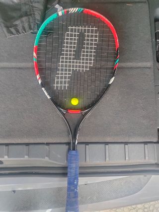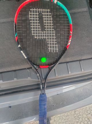 Raqueta de tenis infantil. Tamaño: 25’ pulgadas (63,5 cm) de longitud. Orientada a niñ@s entre 9 y 10 años. Usada y acabado desgastado pero en perfectas condiciones. La compra incluye de regalo: •2 pelotas de tenis de las cuales una es blanda (La naranja. Sieve para aprender fácilmente y sin riesgo). Usadas. • 2 antivibradores NUEVOS. Para mejorar los golpes. • 1 funda pada la raqueta. La cremallera está rota pero sigue sirviendo para proteger y llevar la raqueta y todo lo demás que hay de regalo cómodamente de las correas como se ve en la última foto.