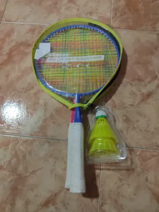 Set de bádminton para niños, ideal para iniciarse en el deporte. Incluye raquetas y volantes. - Raquetas con diseño colorido. - Mango con agarre blanco. - Incluye volantes de plástico amarillo.