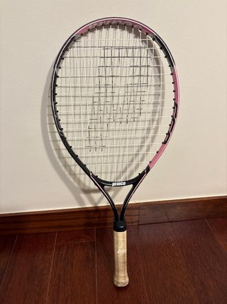 Raqueta de tenis Prince para niños, con funda. - Marco negro con detalles en rosa. - Empuñadura de color beige. - Incluye funda protectora blanca con logo rosa.