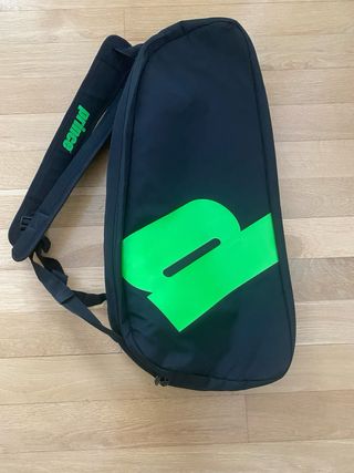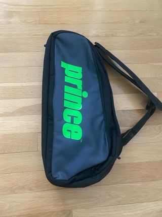 Raquetero de la marca Prince, ideal para transportar tu equipo de tenis. - Diseño en color negro con detalles en verde neón. - Logo de Prince en grande. - Correas ajustables para llevarlo cómodamente. 2 compartimentos para raquetas mas otro bolsillo lateral. Nunca se ha usado