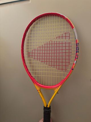 Raqueta de tenis con un diseño llamativo en colores rojo y amarillo. Ideal para jugadores que buscan un equipo con estilo. - Marco de color rojo vibrante. - Detalles en amarillo en el mango y la horquilla. - Cuerdas de color amarillo y rojo.