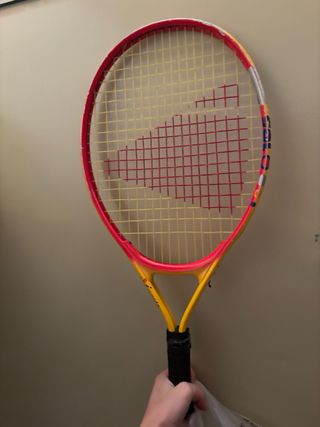 Raqueta de tenis roja y amarilla