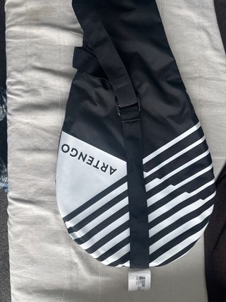 Funda para raqueta de tenis de la marca Artengo. Diseño moderno en blanco y negro con rayas, con su pala - Cierre de cremallera. - Correa ajustable para colgar. - Material resistente.