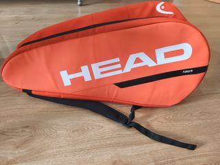 Raquetero de la marca Head Tour, color naranja y con capacidad para seis raquetas. Tiene un diseño bastante funcional con dos espacios para raquetas y otros enseres, dos más pequeños y un espacio para las zapatillas. En muy buen estado.