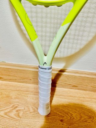 Raqueta de tenis Head Extreme Elite en llamativos tonos verdes y amarillos. - Diseño moderno y deportivo. - Empuñadura blanca. - Cordaje negro.
