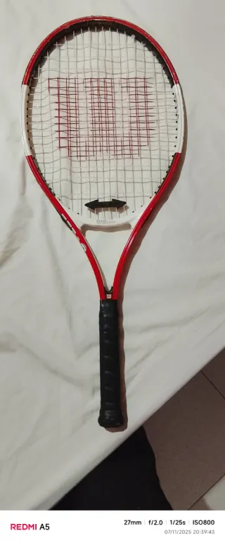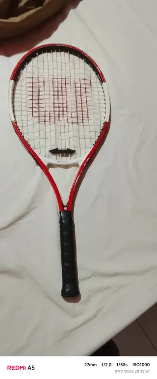 Raqueta de tenis Wilson con marco rojo y blanco. - Cuerdas blancas con logo Wilson en rojo. - Empuñadura negra. - Marco de color rojo y blanco.