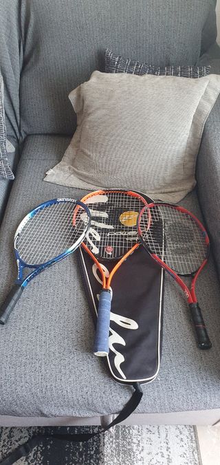 Se venden tres raquetas de tenis de diferentes colores, junto con su funda. - Raqueta azul con detalles plateados. - Raqueta naranja con detalles blancos. - Raqueta roja con detalles azules y negros. - Funda negra con logo blanco.