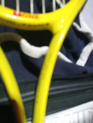 Raqueta de tenis con un diseño llamativo en color amarillo. - Marco de color amarillo. - Cuerdas negras.