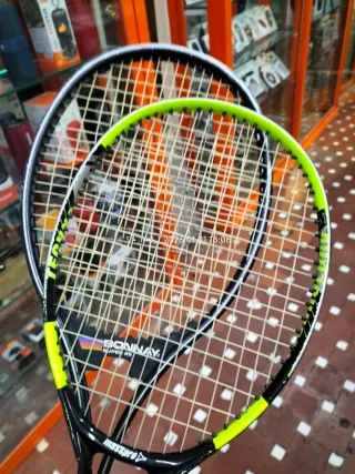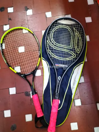 Se venden dos raquetas de tenis, cada una con su funda. - Raqueta con marco negro y detalles en amarillo. - Empuñadura de color rosa. - Funda azul con detalles en amarillo y blanco. - Modelo TL 700 JR visible en una de las fundas.