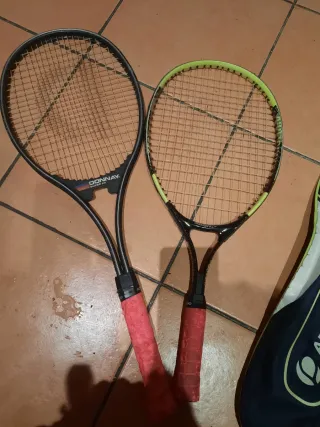 Vendo dos raquetas de tenis usadas, en buen estado. - Una raqueta es marca Masspro, de color negro y verde lima. - La otra raqueta es marca Artengo, de color azul y blanco. - Ambas raquetas incluyen funda.