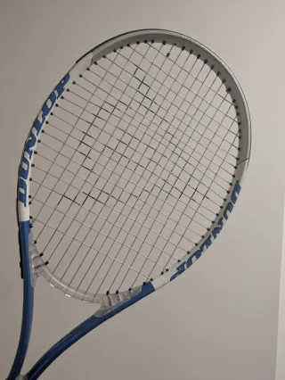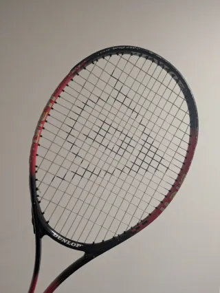 Raqueta de tenis Dunlop con un diseño llamativo en color morado y detalles en azul. - Marco de color morado. - Detalles en color azul. - Cuerdas blancas.