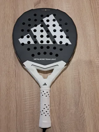 NUEVA Raqueta de pádel Adidas Metalbone Team Light. Comprada el 28 de noviembre 2025 ( demostrable), la he usado dos veces contadas, la vendo por lesión de rodilla. También se vende a parte peletero/bolsa de la marca HEAD. - Pala de pádel con diseño moderno. - Color negro y blanco. - Logo de Adidas visible.
