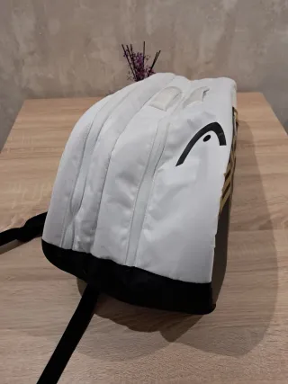 Bolsa de pádel de la marca HEAD, con un diseño elegante en blanco y detalles dorados. Comprada el 28 de diciembre, usada dos veces contadas, de vende por lesión. También se vende a parte raqueta padel Adidas metalbone team light blanca y negra. 120€ - Compartimento principal espacioso. - Cremallera frontal para acceso rápido. - Asa de transporte acolchada.