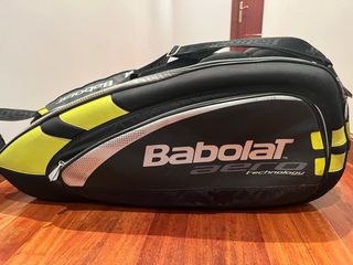 Porta raquetas Babolat con diseño Aero Technology. - Color negro y amarillo. - Correa ajustable para hombro. - Compartimentos amplios. Solo es el porta raquetas, NO INCLUYE las raquetas de la foto. Tiene un par de rozaduras debido al uso.