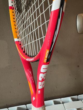 raqueta de tenis Wilson para jóvenes deportistas. Perfecta para iniciarse en el tenis. - Marco de titanio. - Diseño juvenil y ligero. - Incluyo funda y antivibrador en el precio - Opción de 2 por 19 euros