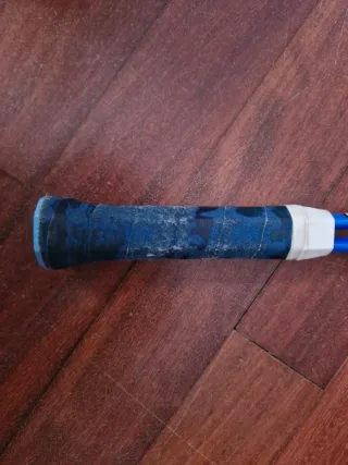 Raqueta de tenis de la marca Artengo. Diseñada para ofrecer un buen rendimiento. - Marco de color azul y blanco. - Cuerdas blancas. - Empuñadura negra. La empuñadura necesita cambiarse y tiene varios rasguños por el uso