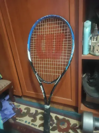 Raqueta de tenis Wilson en color azul y negro, con detalles en blanco. Incluye funda protectora. - Marco de titanio. - Tecnología Power Bridge. - Logo W en las cuerdas.