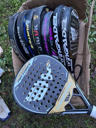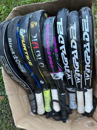 Conjunto de raquetas de pádel de diferentes marcas y modelos. Precio 15€ por unidad - Raquetas con diseños variados. - Mangos con grip para mejor sujeción. - Algunas raquetas muestran el logo de la marca. - Se aprecian detalles de uso en algunas de ellas.