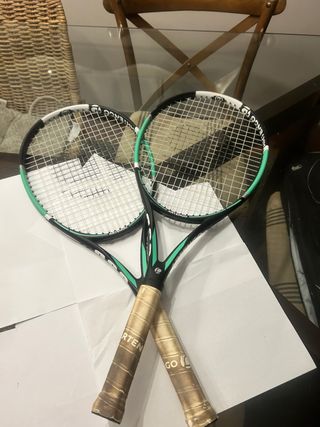 Se vende pareja de raquetas de tenis con funda. - Raquetas con diseño moderno. - Mangos con grip desgastado. - Incluye funda para transporte.