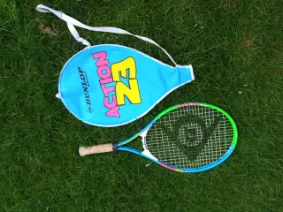 Raqueta de tenis Dunlop Junior con funda. - Raqueta de color azul con detalles en verde y rosa. - Funda azul con diseño Action EZ y correa blanca.