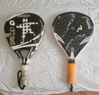 Se venden dos raquetas de pádel, una marca Drop Shot y otra Akkeron. - Raqueta Drop Shot Black Shot. - Raqueta Akkeron. - Ambas con funda de agarre.