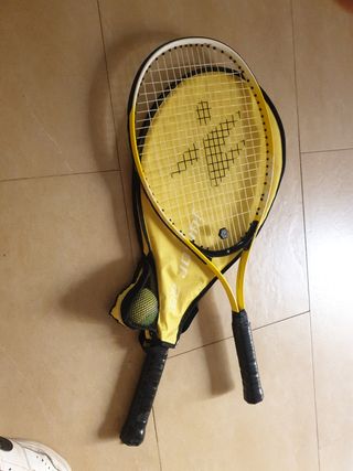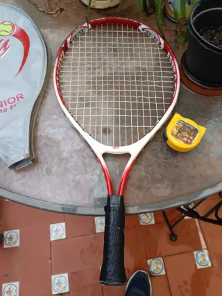 Vendo raqueta de tenis junior, ideal para iniciarse en el deporte. Incluye funda. - Marco blanco y rojo. - Empuñadura negra. - Cuerdas blancas. Se encuentra en muy buen estado y se puede usar perfectamente, sus medidas son 53 cm de alto y 25 cm de ancho, se tendría que recoger en la localidad sevillana de Dos Hermanas