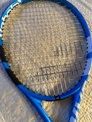 Raqueta de tenis Babolat Pure Drive. Encordado profesional. Barcelona Tenis Lab - Marco azul y negro. - Cordaje de color beige.