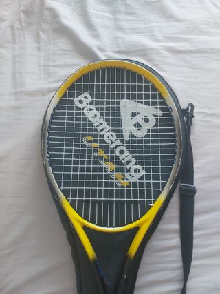 Raqueta de tenis boomerang roja, blanca y negra. Usada pero en buen estado. Marco un poco desgastado pero cuerdas perfectas. Preferible entrega en mano.
