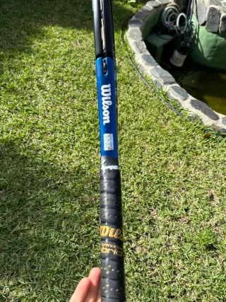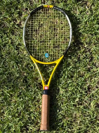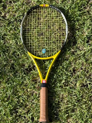 Raqueta Wilson en buen estado, ideal para jugadores de todos los niveles. Se incluye raquetero. En perfecto estado, solamente con algún entrenamiento ,ideal para jugar de manera competitiva o incluso academica. - Marco de color amarillo y negro. - Cuerdas tensadas. - Empuñadura de cuero. - Raquetero de regalo.