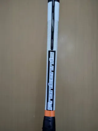 Raqueta Babolat para frontenis con un peso de 275 gramos. Diseñada para un buen manejo y control. Tiene roces en la pintura del uso. - Marco con detalles en blanco y naranja. - Grip negro para un agarre firme. - Cuerdas blancas.