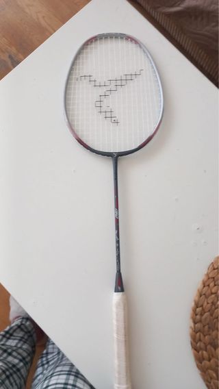 Raqueta de bádminton con diseño moderno. - Marco de color gris y rojo. - Empuñadura cubierta con cinta blanca.