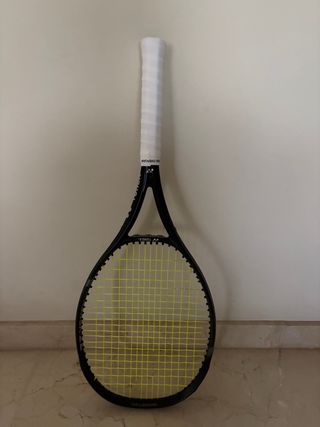 Raqueta de tenis Yonex Vcore 98. Grip 4, peso 305g. - Cuerdas amarillas Yonex 1.2mm Polytour Usado y Con arañazo como se ve en la foto, pero sin ningun defecto en el marco. Por cambio de raqueta a Yonex Ezone lo vendo.