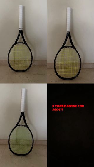 Se venden 3 raquetas de tenis Yonex Ezone 100. Cordaje y grips nuevos. - Modelo: Yonex Ezone 100 - Cantidad: 3 unidades - Precio total: 360€