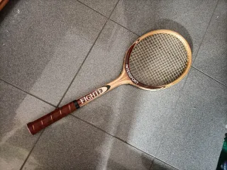 Raqueta de tenis antigua de la marca Captain. Un objeto clásico para coleccionistas o para revivir viejos tiempos. - Marco de madera. - Cuerdas blancas y rojas. - Detalle del logo Captain en el mástil.