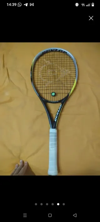 Raqueta de tenis con marco amarillo y blanco. - Cuerdas blancas. - Empuñadura negra. Apenas se ha usado