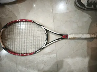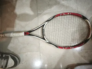Raqueta de tenis para niñ@s, ideal para principiantes. Es una raqueta usada, en buenas condiciones, con algunos signos de desgaste. - Diseño rojo y negro. - Mango con agarre cómodo.